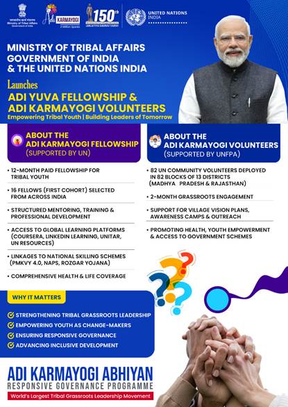 - The Ministry of Tribal Affairs (MoTA), in partnership with the United Nations in India, has launched the Adi Yuva Fellowship and the Adi Karmayogi Volunteers Programme under the umbrella of the Adi Karmayogi Abhiyan — a flagship initiative envisioned as the world’s largest tribal grassroots leadership movement.