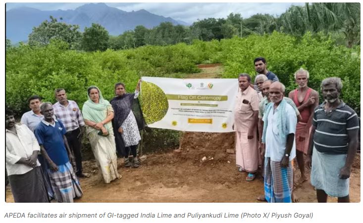 - The Agricultural and Processed Food Products Export Development Authority (APEDA) has facilitated the first-ever air shipment of GI-tagged Indi Lime (Karnataka) and Puliyankudi Lime (Tamil Nadu) to the United Kingdom. The initiative marks a significant step in expanding India's agricultural export basket and enhancing global recognition of region-specific products.