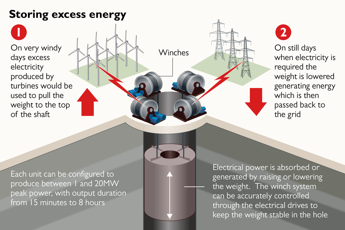 - When electricity demand exceeds supply or renewable generation falls, the mass is released to descend under gravity.