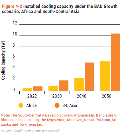 - Cooling capacity expected to increase 2.6 times (from 22 TW to 58 TW) by 2050.