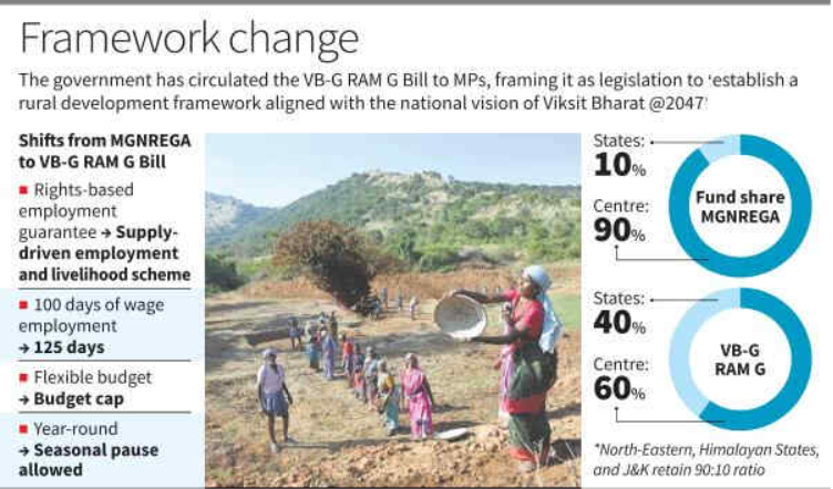 The Union Government has introduced the Viksit Bharat–Guarantee for Rozgar and Ajeevika Mission (Gramin) Bill, 2025 (VB-G RaM G) in the Lok Sabha to replace the Mahatma Gandhi National Rural Employment Guarantee Act (MGNREGA), 2005.