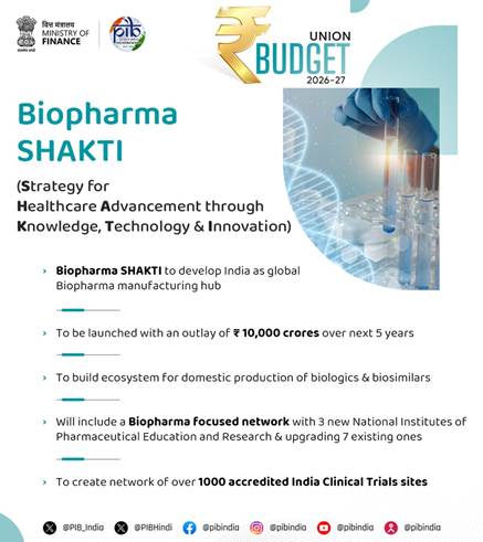 Biopharma SHAKTI aims to position India as a global manufacturing hub for biologics and biosimilars, with an outlay of ?10,000 crore over five years.