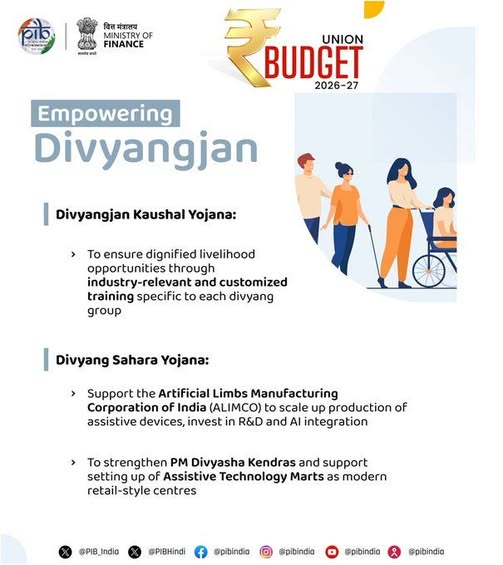 The Union Budget 2026–27 reinforces the commitment to inclusive development by introducing two targeted initiatives for persons with disabilities (Divyangjan): the Divyangjan Kaushal Yojana and the Divyang Sahara Yojana. These schemes aim to enhance dignified livelihood opportunities and ensure access to advanced assistive technologies, aligning with the broader vision of equitable participation in economic and social life.