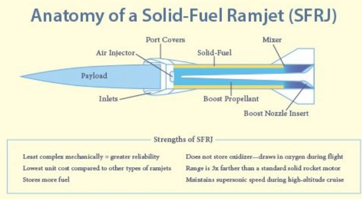 - A solid fuel ducted ramjet motor then produces sustained and controllable thrust throughout the missile’s flight.