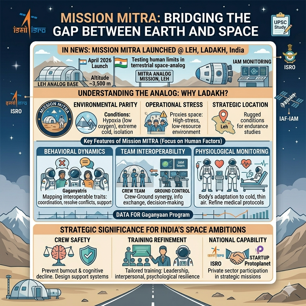 Recently, the Indian Space Research Organisation (ISRO) launched Mission MITRA (Mapping of Interoperable Traits and Response Assessment) in Leh, Ladakh. This pioneering study, conducted in collaboration with the IAF-Institute of Aerospace Medicine (IAM), marks a critical step in India’s Gaganyaan program by testing the behavioral and physiological limits of astronauts in a terrestrial space-analog environment.