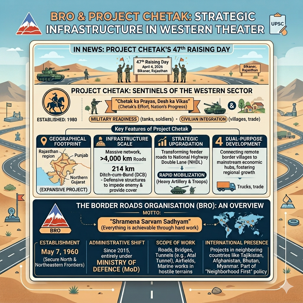 The Border Roads Organisation (BRO) recently commemorated the 47th Raising Day of Project Chetak on April 4, 2026, in Bikaner, Rajasthan.