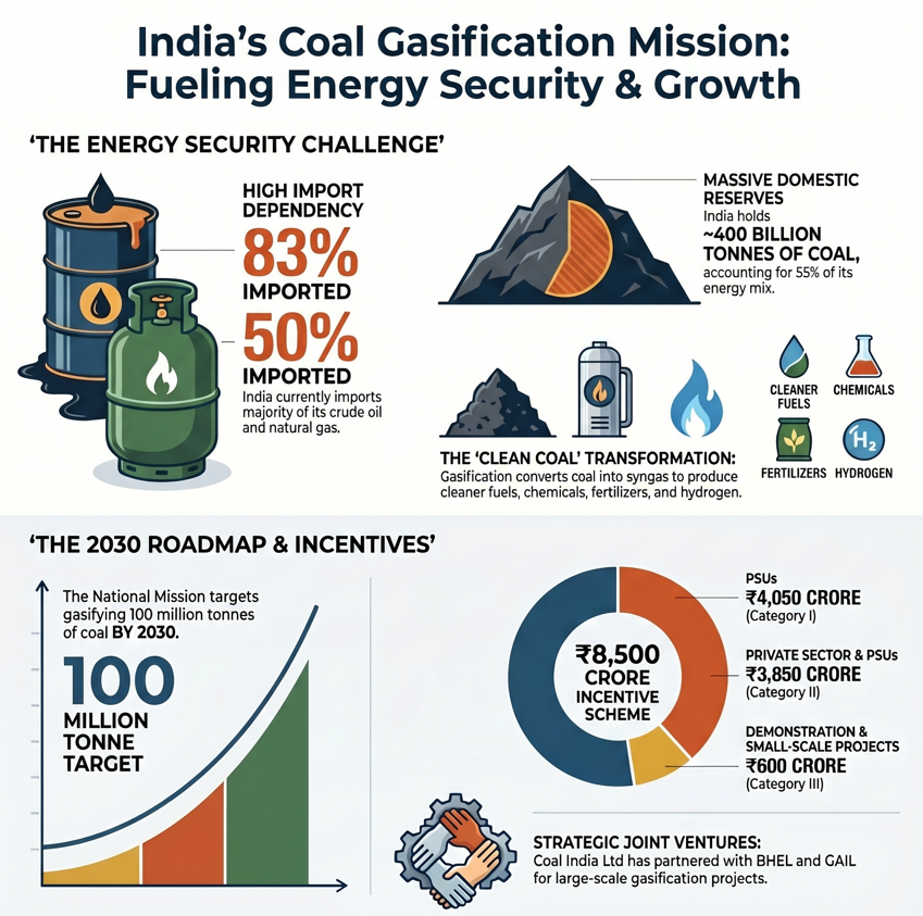 - The scheme's primary target is to achieve 100 million tonnes of coal gasification by 2030, positioning it as a key component of India's clean coal transition strategy.