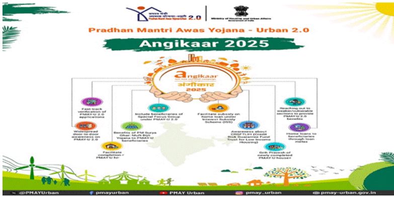 The Ministry of Housing and Urban Affairs (MoHUA) has launched Angikaar 2025, a nationwide outreach campaign under the Pradhan Mantri Awas Yojana – Urban 2.0 (PMAY-U 2.0). The initiative seeks to bridge last-mile implementation gaps, accelerate housing delivery, and ensure that welfare benefits reach vulnerable urban families.